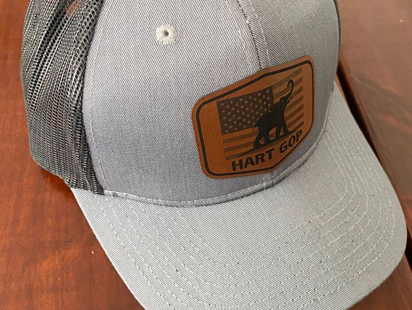 Introducing the Hart GOP Leather Patch Hat – a sleek and powerful symbol of your membership in the Hart County Republican Party! This stylish grey hat features a bold elephant design contrasted against the American flag, with "Hart GOP" proudly embossed on a leather patch. Crafted for comfort and durability, this exclusive design embodies unity and conservative values. Elevate your style and proudly showcase your party pride – get your Hart GOP Leather Patch Hat now and wear your affiliation with confidence!